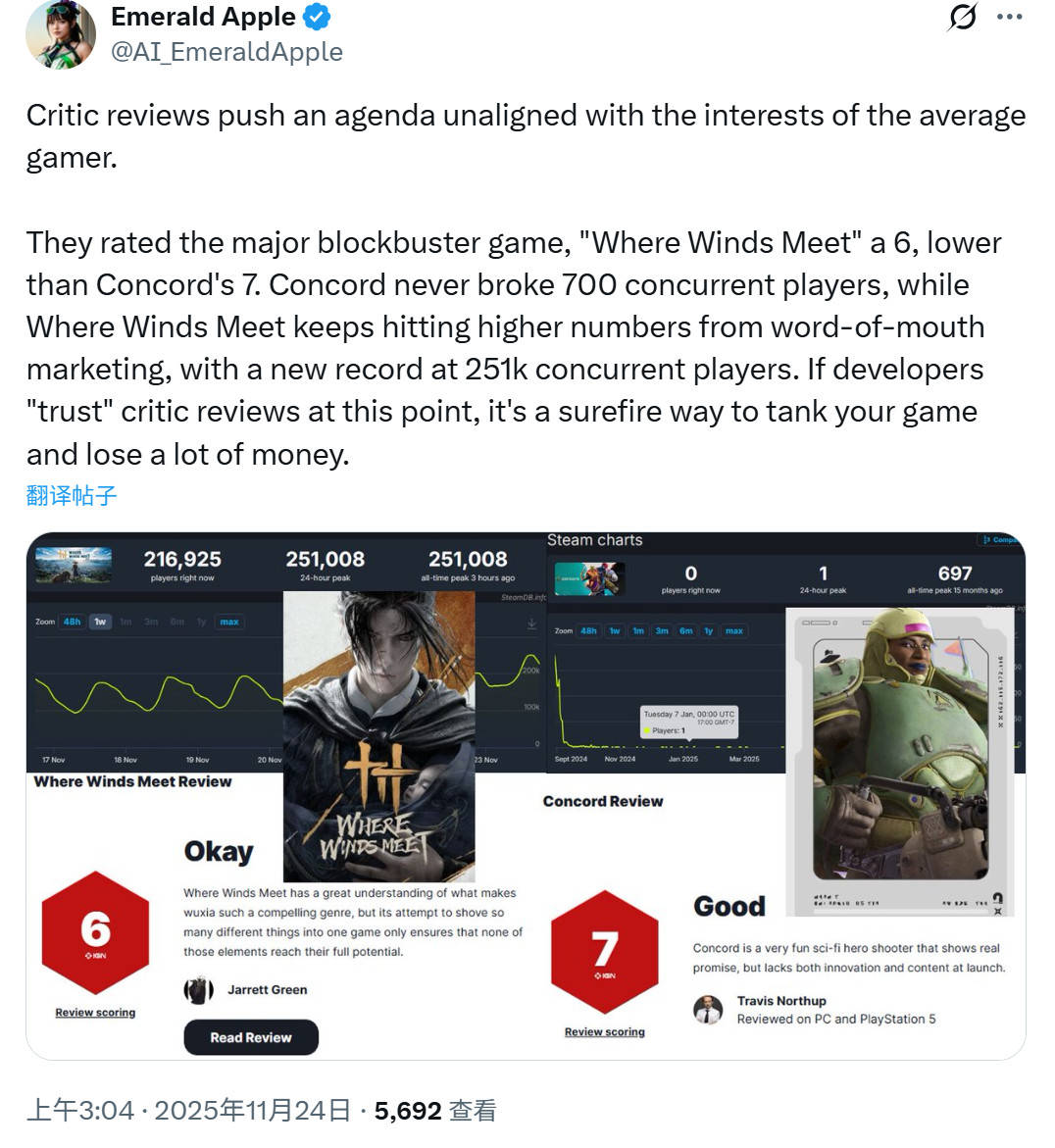 他举例称,《燕云十六声》在部分媒体处仅获得6分,评分甚至低于规模更小的射击游戏《星鸣特攻》——后者媒体评分为7分,但其最高同时在线,与《燕云十六声》的爆发式增长完全不在一个量级。他认为,如果开发者过度依赖这些媒体分数进行产品决策,无异于“自毁前程”,不仅会误判游戏发展方向,甚至可能导致投入失衡、项目走向失败。